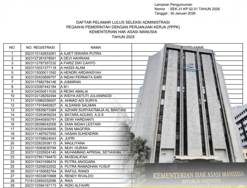 Siap-Siap! Pengumuman Seleksi Administrasi PPPK KemenHAM 2026 Dirilis Hari Ini Jumat, 30 Januari 2026 11:18 WIB | dilihat: 493 kali